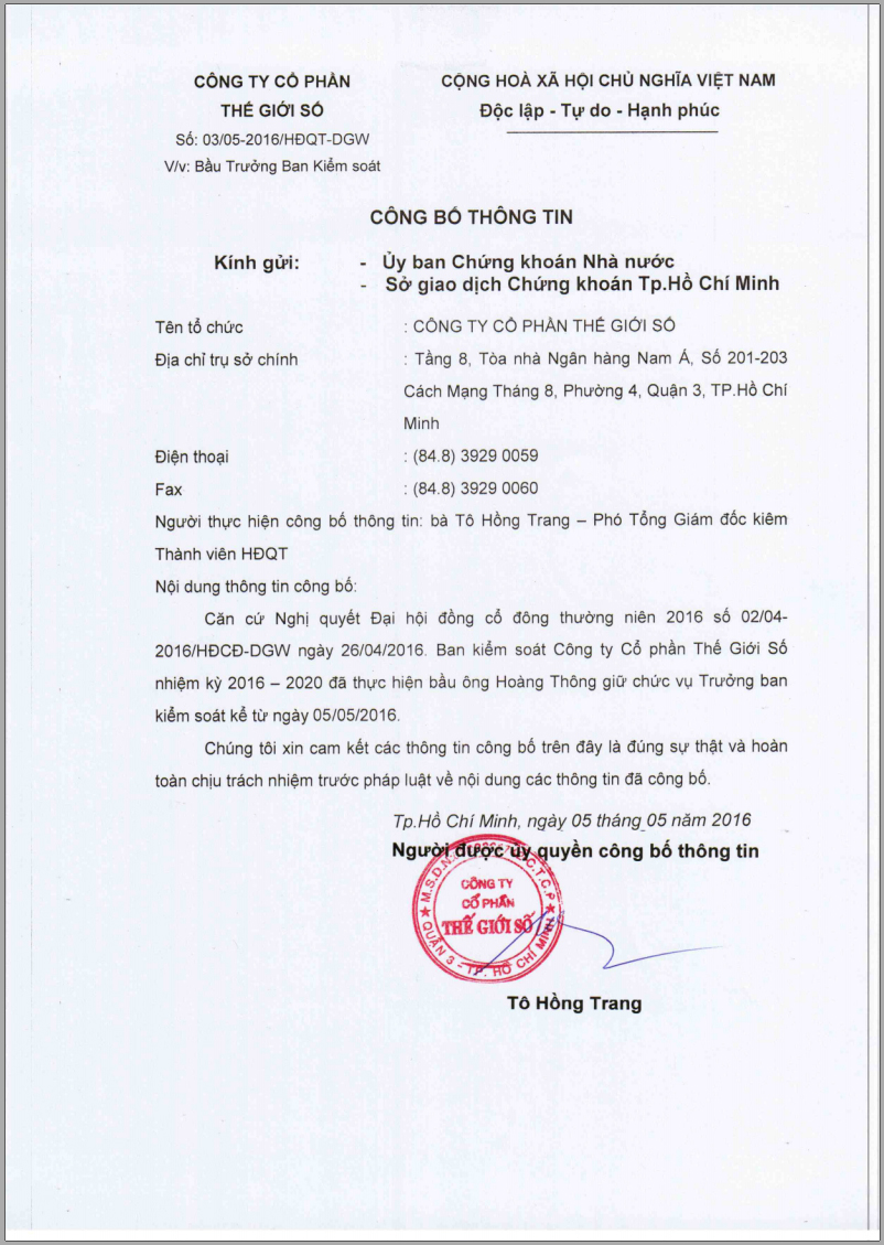 CBTT bầu trưởng ban kiểm soát công ty nhiệm kỳ 2016-2020