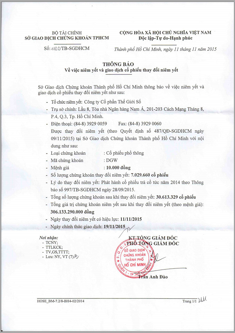 CBTT về TB niêm yết và giao dịch cổ phiếu thay đổi niêm yết cổ phiếu DGW của HOSE