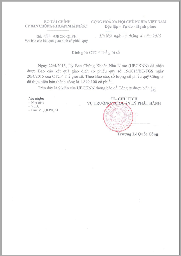 Công văn chấp thuận báo cáo kết quả giao dịch cổ phiếu quỹ của UBCK NN