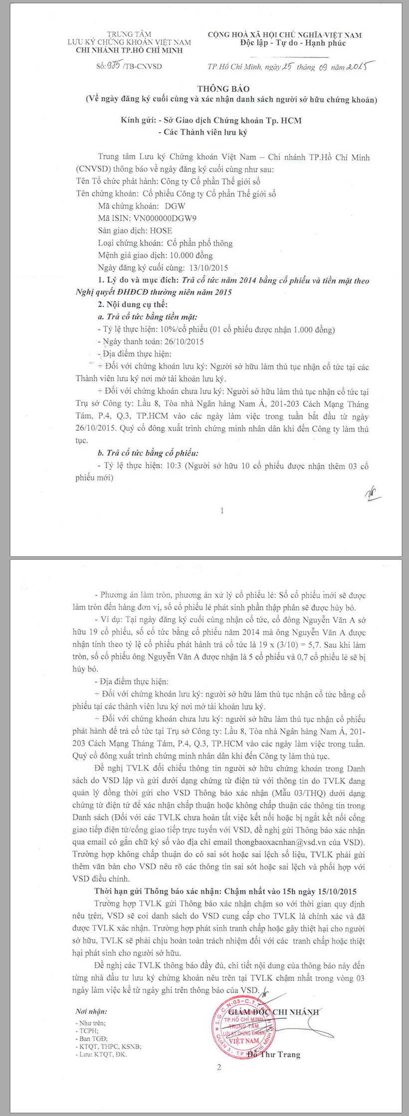 Công văn của Trung tâm Lưu ký chứng khoán (VSD) về ngày đăng ký cuối cùng và xác nhận danh sách người sở hữu chứng khoán