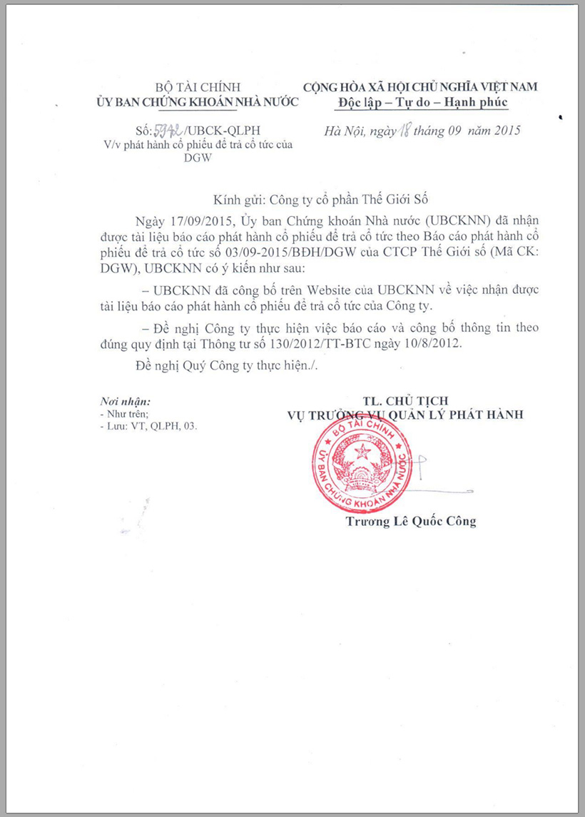 Công văn của UBCKNN về việc phát hành cổ phiếu trả cổ tức năm 2014