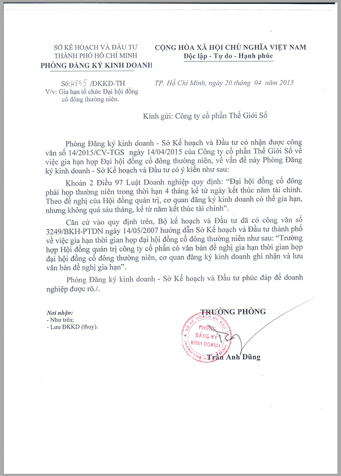 Phòng Đăng ký kinh doanh - Sở Kế hoạch và Đầu tư phúc đáp