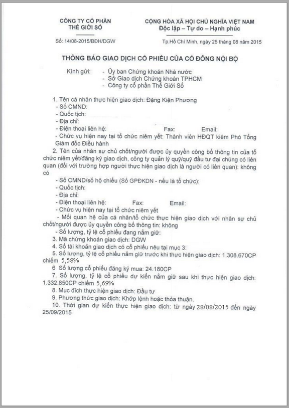 Thông báo giao dịch cổ phiếu của Bà Đặng Kiện Phương