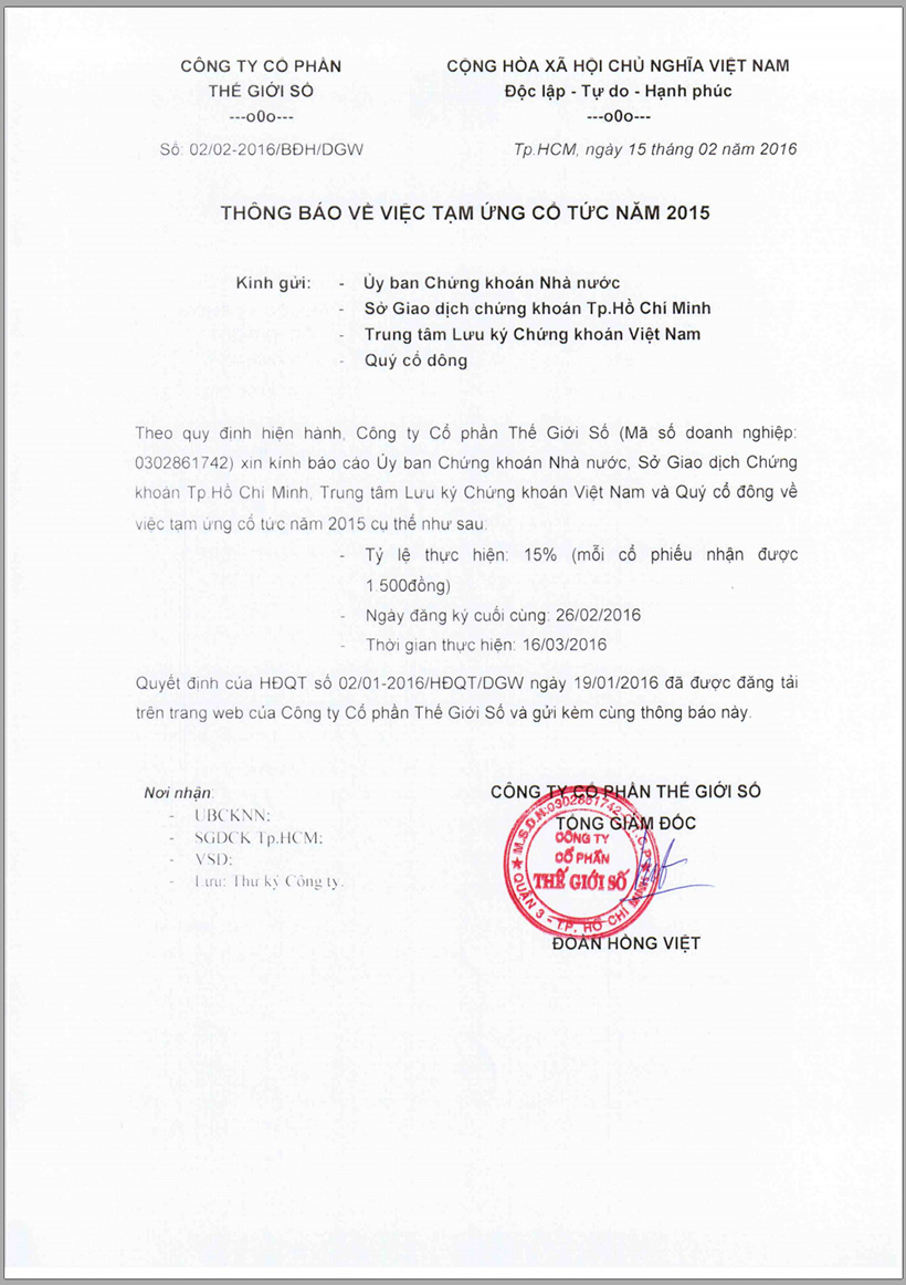 Thông báo về việc tạm ứng cổ tức năm 2015